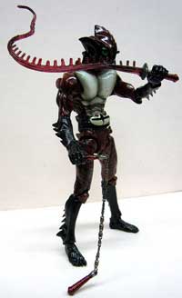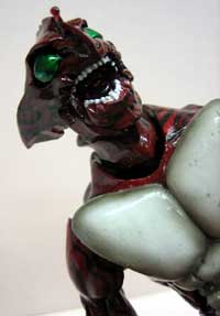 妙な絵の具を体につけたりなど、不思議なシーンの連続でしたが、今までメカニカルな描写が多かった分、当時は衝撃だったはず。ホビージャパン連載のS.I.C.サイドストーリーでは、彼の命である”ギギの腕輪”を装着する前の段階で、パワーが半減している状態”プレ・アマゾン”が登場しました。 平成ライダーでいうクウガ・グローイングフォーム、または角が短い状態のギルスといった、 いわゆる「サナギマン」状態なんですが、昭和ライダーではこのような描写がないので(BLACKの変身段階に”バッタ男”というのはありましたが)、面白かったですね。 そんなS.I.C.サイドストーリーのアマゾン・オリジナル形態”プレ・アマゾン”のカスタムS.I.C.入荷致しました! ボディーと目のカラーリングを反転させるだけで、かなり印象が変わりますが、まだ覚醒していない雰囲気が瞳が緑色になる事によって表現されています。