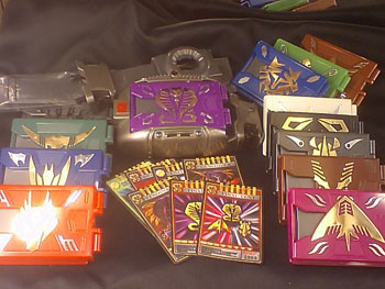 先に販売されたVバックルは龍騎・ナイト・ゾルダのデッキが付属していましたがまさか残りの10人のバックルも出るとは・・・・。 付属するRKナンバーのカード(特にシザースのカード)も嬉しかったものです。このセット入手するのに当時はかなり苦労しましたので・・・・。 厳密にはTV版、劇場版、TVSP版とも13人全員が一同に会することがなかっただけになおさらですね・・・・。 ライダーの変身ベルトとしては「光る!鳴る!」は継承しつつも本格的に「回る!」のギミックが無い初のベルトでもあり形態や形状は異なっても「装填」するというギミックを後のライダーに大きく影響を与えたベルトでもあります。 セットされたバックル部分は先に販売されたメッキとは異なる重厚なガンメタルカラー。セットされた龍騎とナイトのバックルはともにサバイブ仕様。 今回ご紹介のセットは箱なし・並品・可動のものです。 カードダス「アドベントカード・テレビディションセット」つき。 仮面ライダー龍騎 バンダイ 変身ベルトVバックル 13ライダーセット 箱入り・開封美品も販売中です。 コンプレックス 7階 TOYコーナー