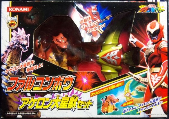 さて、ご紹介するのはセイザータリアスの武器ファルコンボウとアケロン大星獣のセット。一昔前でいうサウンドバトラ○系と同様のセンサー搭載のなりキッズアイテム。ファルコンボウで撃ってあたるとアケロン大星獣がアクション!!クローンアケロン大星獣はソフビで発売されましたがこっちは商品化も少ない。前述のように遊べるアイテムなだけに少々ディフォルメテイスト。これまた残念なことに評価が今ひとつ上がらないだけに価格はお手軽・・・・。