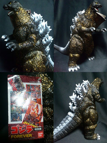 バンダイゴジラソフビの最高峰!!ゴジラFOREVERシリーズの世紀末覇王ゴジラが再び入荷。ラドンから受けた生命エネルギーは金ラメで再現。ソフビそのものに練り込まれているのではなく表面に吹きつけられているのが最大のポイント。さわり過ぎると落ちちゃいますからね・・・・。