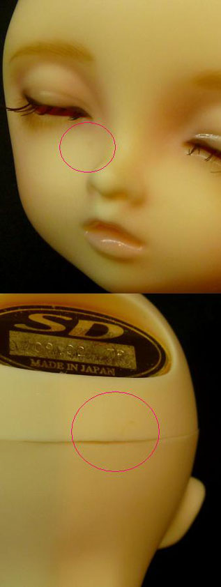 向かって左目と鼻の間くらいに小さい点のようなヨゴレがあります。