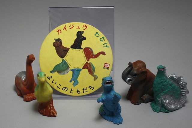 台紙、ビニール袋にカイジュウ5体(アロザウルス欠品)、トラコドンの背中にマジック書込み、輪5本付