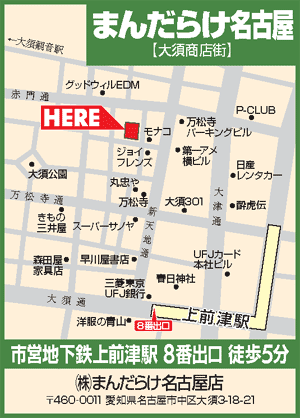 まんだらけ名古屋店(詳しい店舗地図はこちら) 〒460-0011 愛知県名古屋市中区大須3丁目18-21 e-mail nagoya@mandarake.co.jp